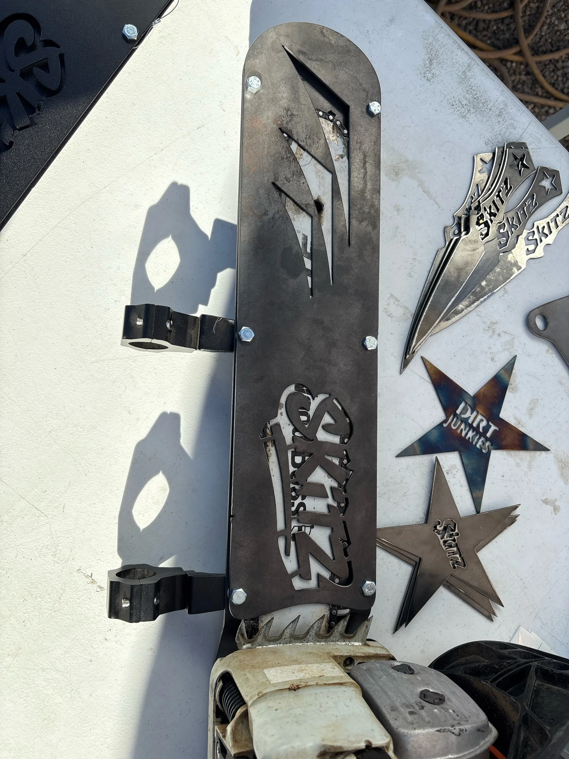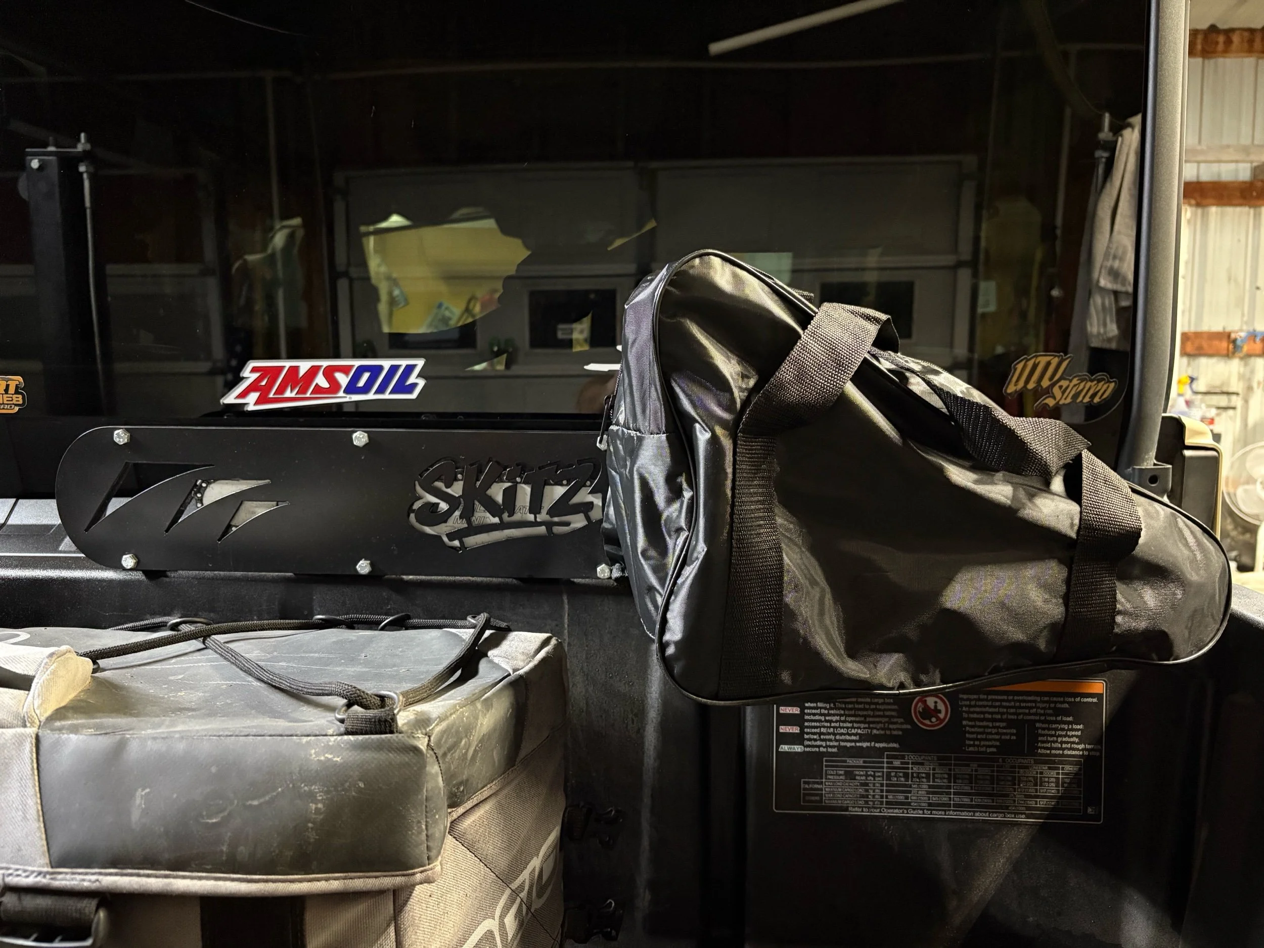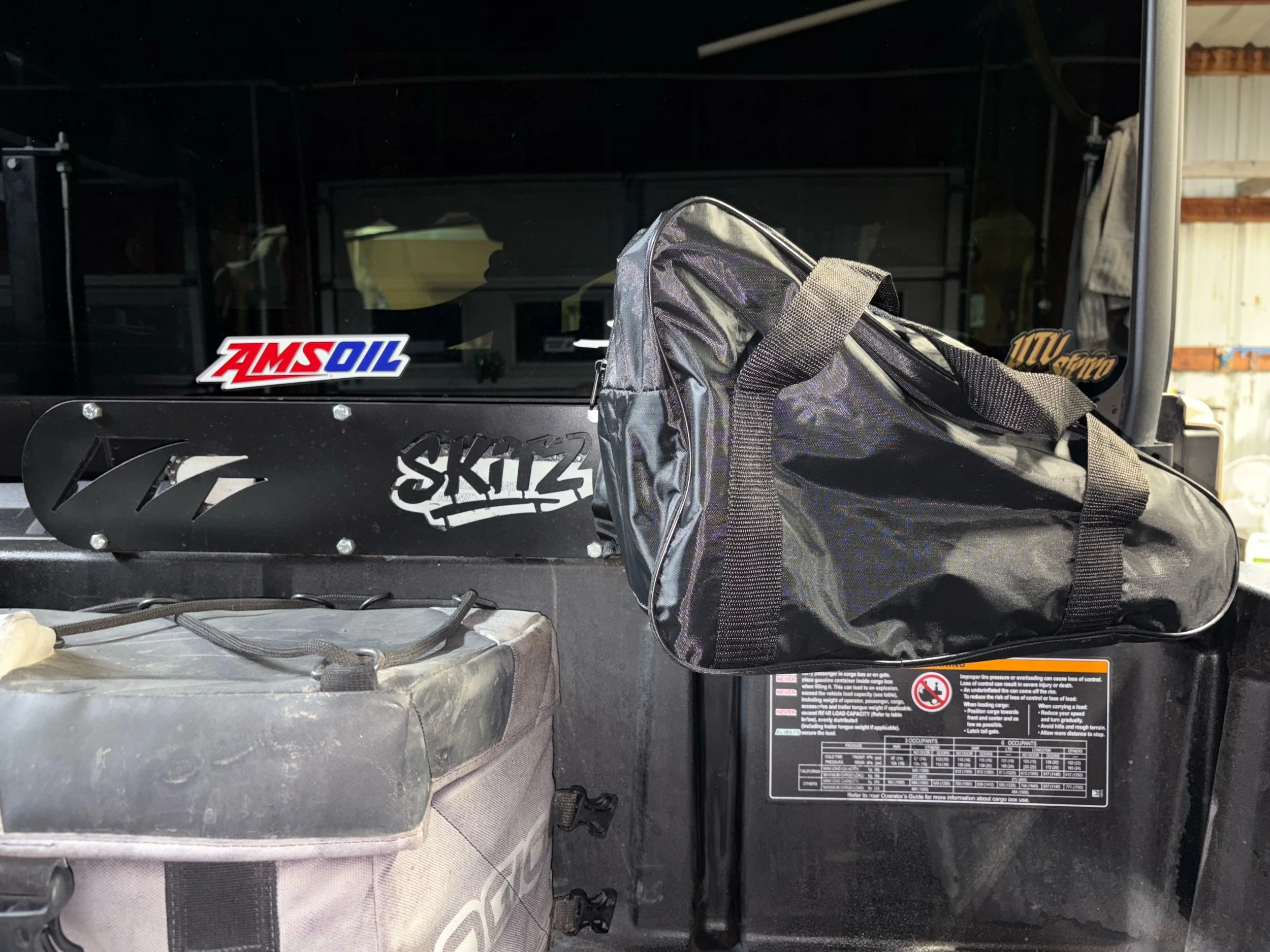 Can Am Defender chainsaw mount made of 16 gauge steel and powder coated in satin black finish. This will mount to the top of your bed rail with no drilling required.